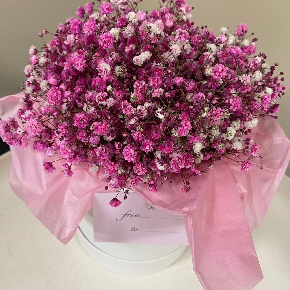 “Сиреневый туман” – композиция из гипсофилы в шляпной коробке