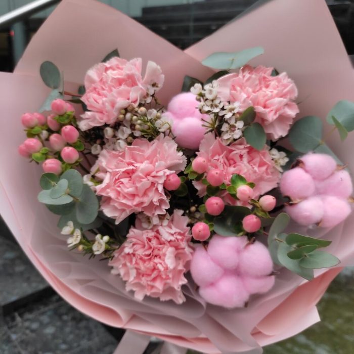 Гвоздика – 5 шт.Хлопок – 3 шт.Гиперикум – 2 шт.Ваксфлауэр – 1 шт.Эвкалипт – 1 шт.Упаковка дизайнерская – 2 шт.Лента – 2 шт.