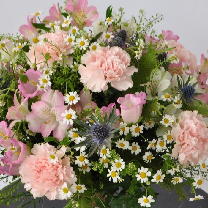 Ароматный букет с ромашками, колокольчиками и гвоздиками.Прелестные стойкие цветы слились в великолепном вальсе с голубыми колючками эрингиума, создавая непередаваемую атмосферу свободы, расслабления и счастья!Букет в европейском стиле, собран для вручения без упаковки!Будет красиво смотреться в вазе – круглый и нарядный со всех сторон!Истинная красота цветов для вашей ненаглядной.Доставим на воде и коробке, бережно и с заботой)