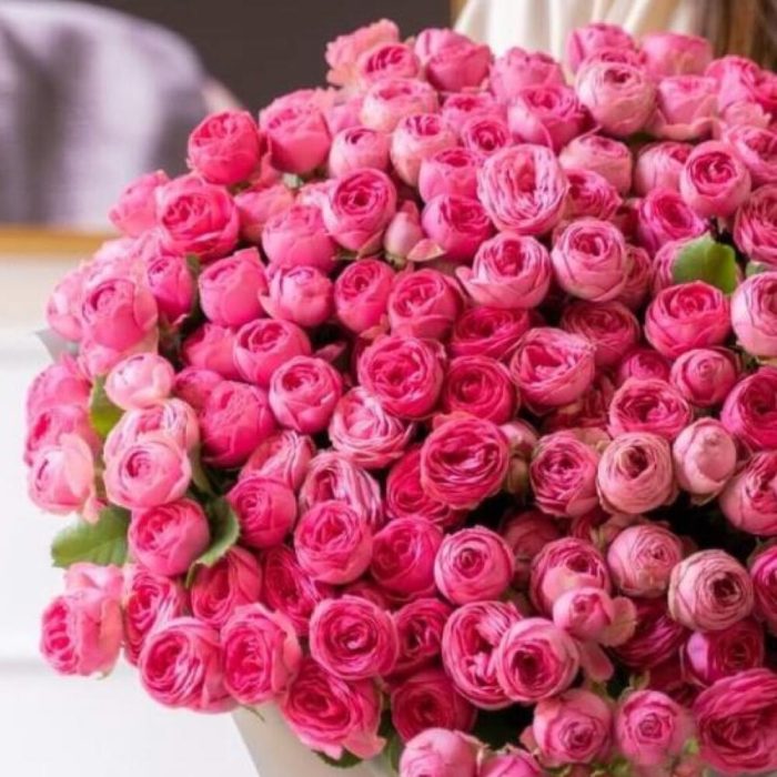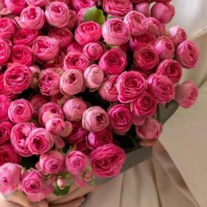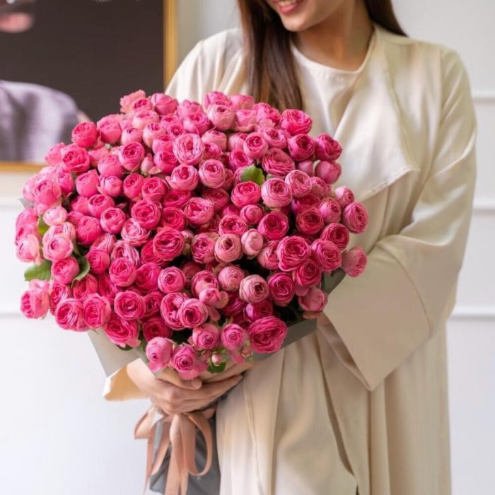 Роза кустовая пионовидная – 51 шт.Лента атласная – 2 шт.Открыточка с вашими пожеланиями – 1 шт.хорошее настроение – 100 шт.инструкция по уходу за цветами – 1 шт.коробка переноска – 1 шт.Кризал – 1 шт.