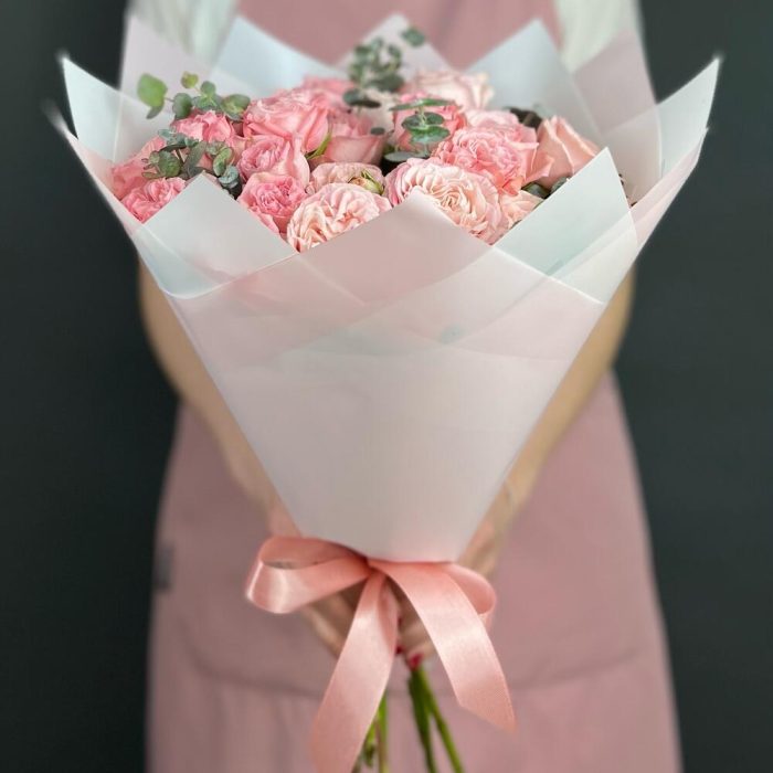 Эвкалипт – 5 шт.Лента атласная – 1 шт.Роза кустовая пионовидная – 7 шт.бумага дизайнерская – 5 шт.