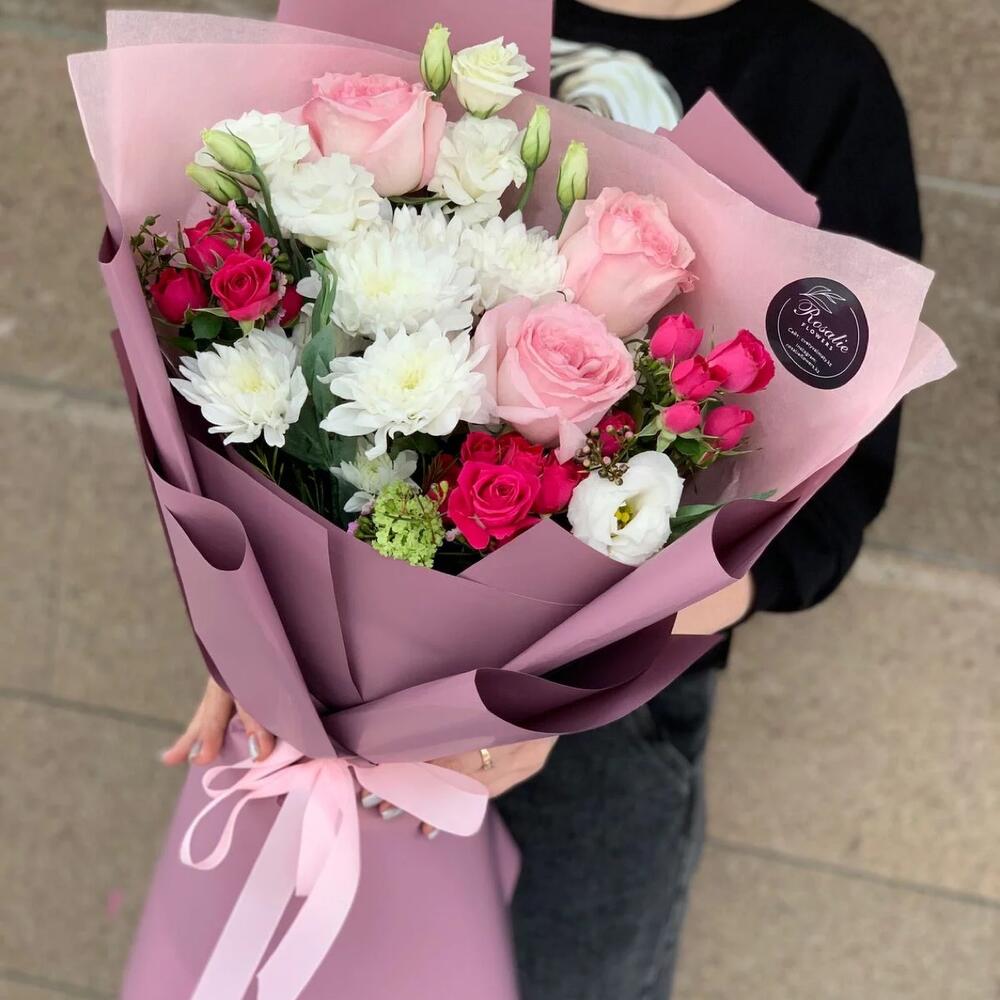Гвоздики, Лизиантусы, Розы, Тюльпаны