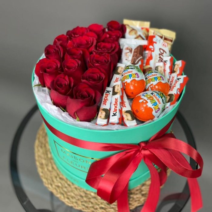 “Сладкое сердце ” – цветочная композиция с сладостями в коробке “Сердце”