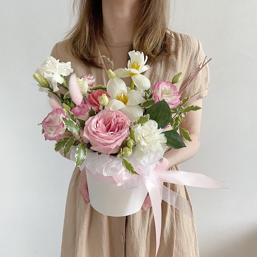 Роза пионовидная – 1 шт.Диантус – 3 шт.Тюльпан – 2 шт.Лизиантус – 1 шт.Питтоспорум – 1 шт.Лагурус – 2 шт.Коробка шляпная – 1 шт.Губка флористическая – 1 шт.