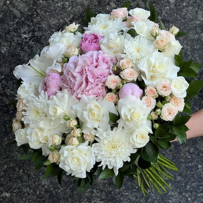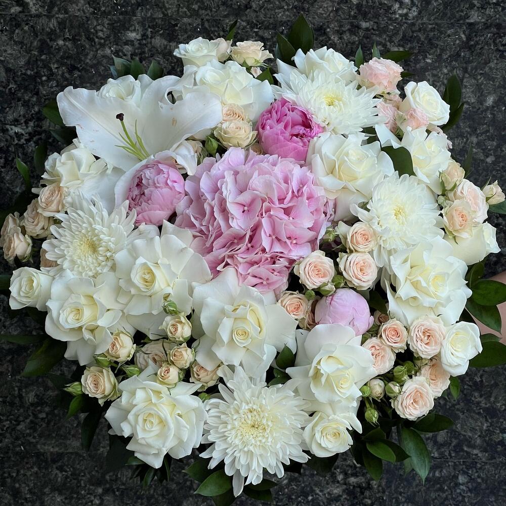 Альстромерии, Гвоздики, Кустовые розы, Лизиантусы, Розы, Хризантемы
