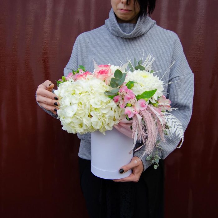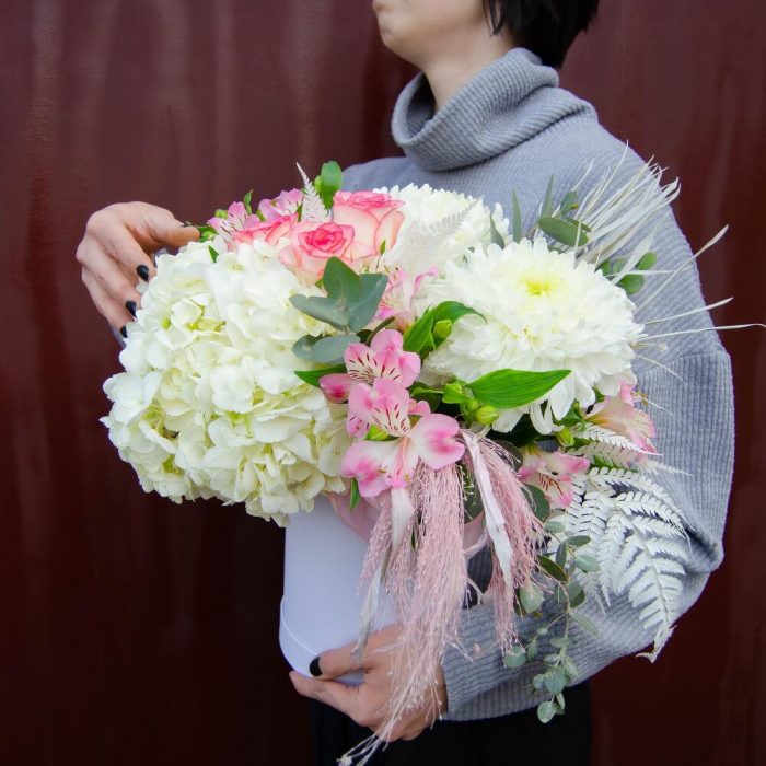 Гортензия – 1 шт. Роза – 3 шт. Альстромерия – 3 шт. Циперус – 2 шт. Папоротник – 1 шт.