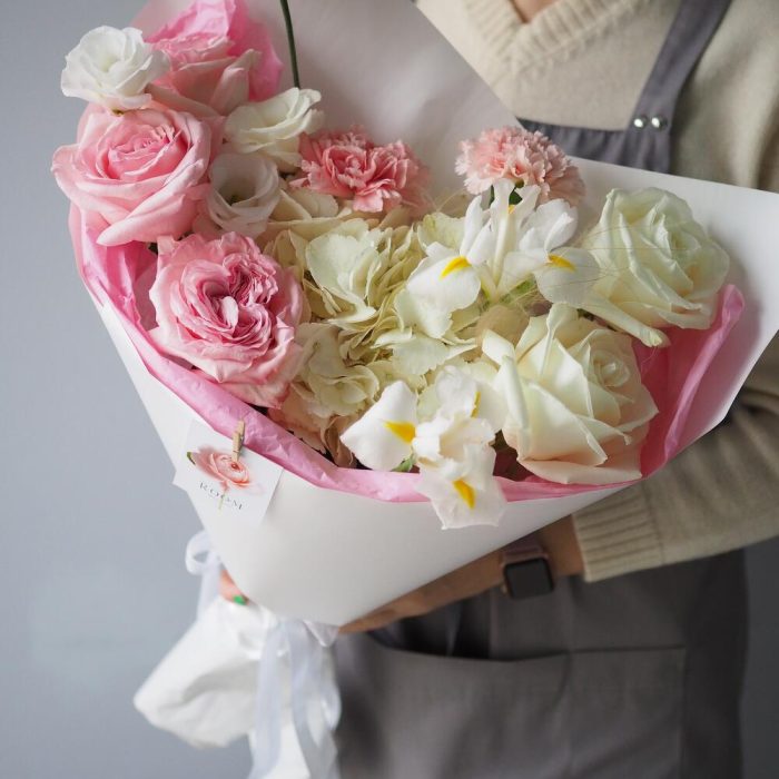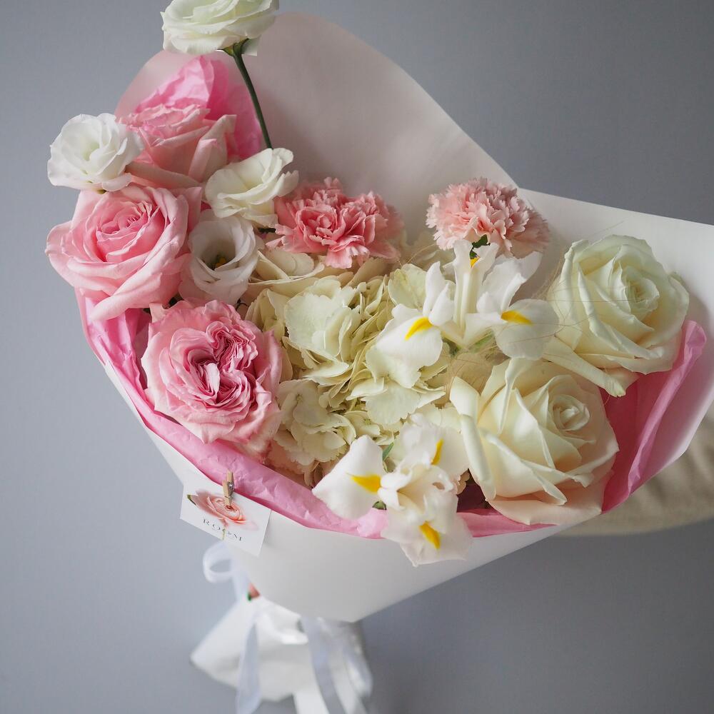 Альстромерии, Гортензии, Кустовые розы, Лизиантусы, Розы, Хризантемы