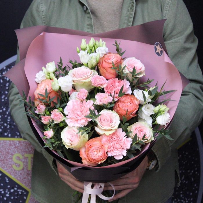 роза фруттето – 5 шт.Роза пионовидная кахала – 4 шт.Эустома – 3 шт.пионовидная кустовая роза мадам бомбастик – 2 шт.Диантус – 3 шт.Эвкалипт – 3 шт.Пленка матовая – 3 шт.Лента атласная – 2 шт.